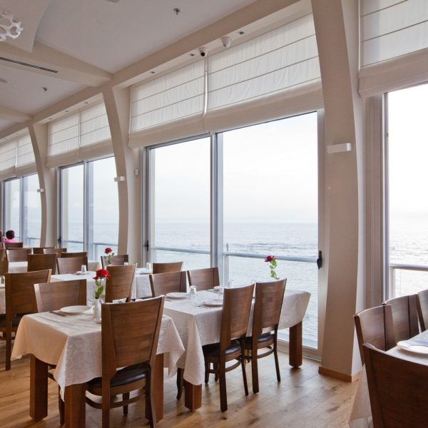 The large and spacious restaurant is located right on the shoreline and has floor to ceiling windows that introduce the sea into the restaurant. Outside the restaurant there is a beautiful wooden deck, partially roofed and partially shaded by sunshades, and a stone terrace adjacent to a wall that sea waves come crushing into.