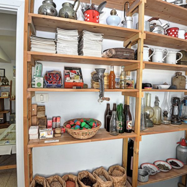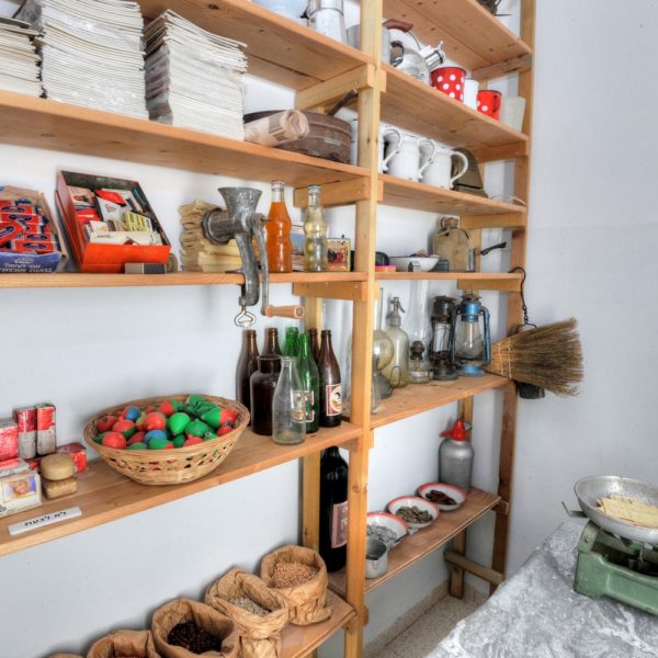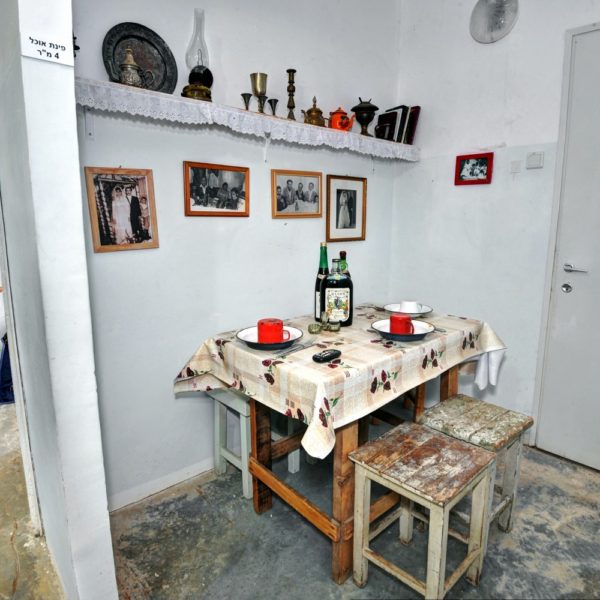 One of the interesting exhibits in the Museum is a precise reconstruction of a home, including the original concrete floor, a living room with authentic furniture from the fifties as well as a sideboard called by the settlers “a buffet”, a radio, record player, table, sofa, kitchen with a wooden ice box, shelves decorated with lace ribbons, food utensils, a spirit cooker, a tea tray with a brass tea pot and small tea glasses, a meat grinder, a “Fireside” heater which was found in almost every home in Israel, a dining corner with a wooden table surrounded by original stools with wine bottles for Kiddush (blessing on the wine) from 1964. A bedroom for the children in which two children slept head to toe in a narrow Jewish Agency bed on straw mattresses and Jewish Agency wool blankets. Even an original school satchel is displayed here.
