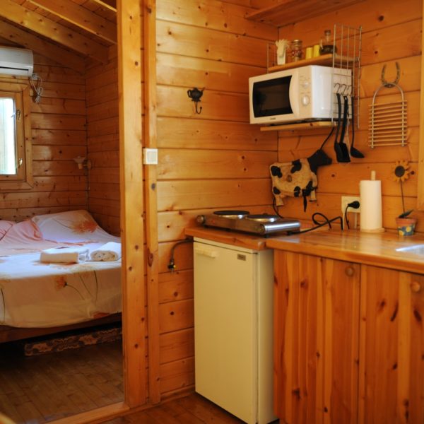 The Guest Rooms are located in the thick of the wood, where you can retire at any given time and arrange a private festive meal. The guest rooms themselves are the perfect place for lovers of nature, peace and quiet. Eyal and Edna offer two entirely discrete cabins, so that guests don’t have to worry about neighbors. The cabins are spacious and consist of a living room and a separate bedroom as well as a Jacuzzi of course. The kitchen features coffee in various flavors, homemade cake, cookies, seasonal fruit, fresh vegetables, jams, wine and a variety of products from our own dairy farm. The cabins are well and abundantly accessorized, offering a huge selection of videos with a compatible entertainment system.
