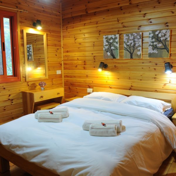 The chalets named Orange, Avocado, Pomegranate and Fig, were planned and designed by the two of them. One of the cabins is completely adapted to the needs of the disabled. Contrary to ordinary cabins, the Fruit Scent units are tall two-story structures featuring: a first floor with a spacious couple’s bedroom, a living room, a bathroom and an accessorized kitchen offering complete cooking facilities (as well as a built outdoors grill). The gallery features three beds and a window with a view to the Galilee; a ‘little house in the prairie’ look-alike with standard stairs.
