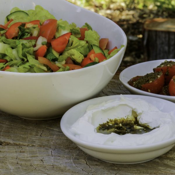 More than ten sorts of salads are served to the table, as well as jams, olives, tehina, labaneh (soft white goat’s milk cheese), muesli, buns, pita bread, breads, pancakes, pizza, Belgian waffles, all homemade and gluten-free.