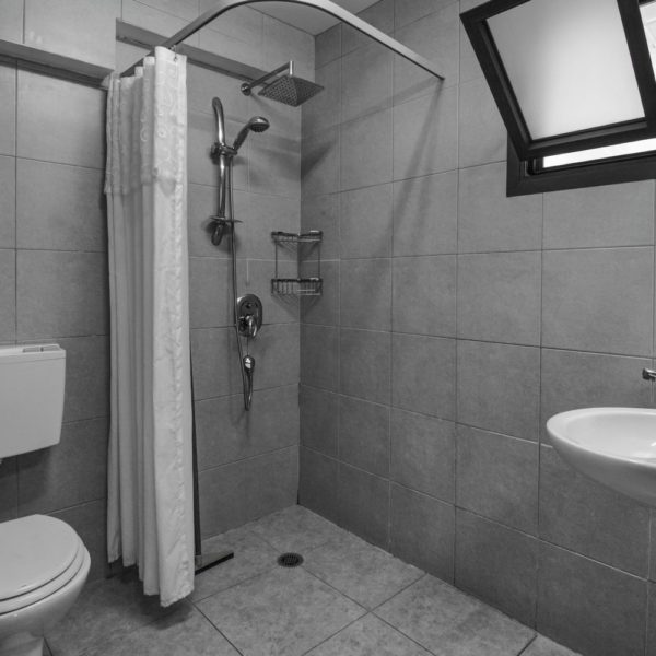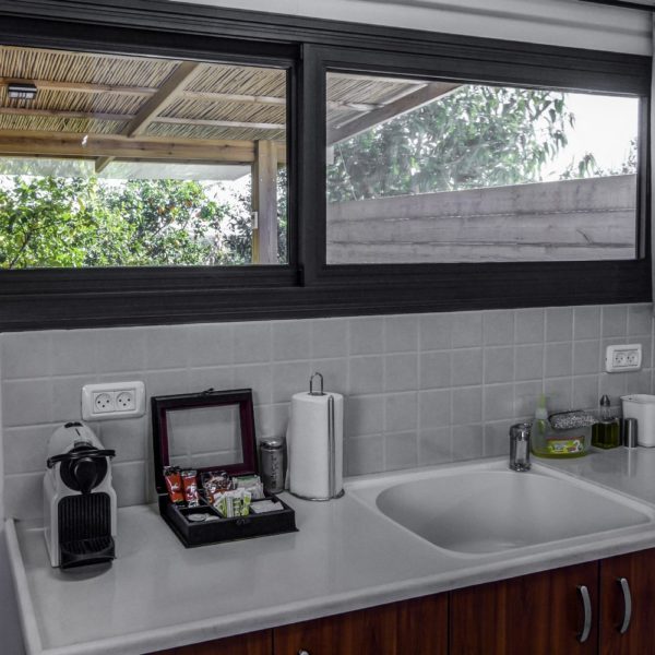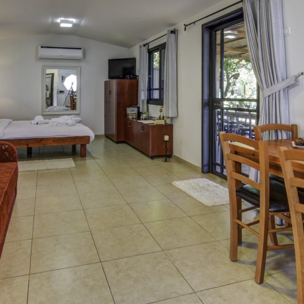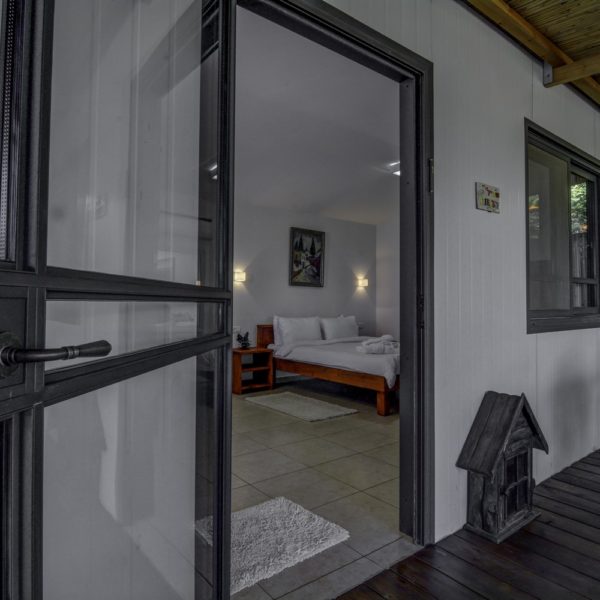 The boarding house is relatively large, measuring about 40m2, and it contains a double bed covered by white pure beddings, a sofa that opens into a one and a half bed, a cable TV screen, a well-equipped kitchenette and dining area, a shower stall and a toilet.