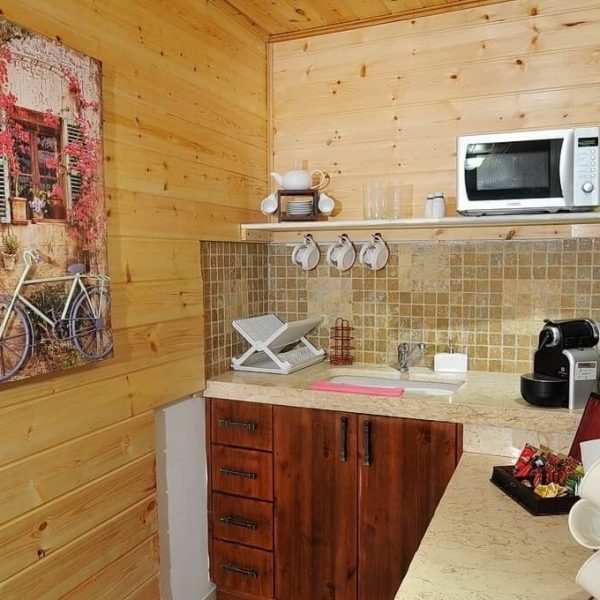 בחדר השינה מיטה זוגית נוחה ומולה טלוויזיה בכבלים . במטבח :קפה מכונת אספרסו פלטת שבת, קומקום חשמלי, מקרר, מיקרו גל וכלים להגשה. חדר הרחצה מרווח ובו אביזרי אמבט ומגבות רכות . בחדר הילדים  – מיטת קומותיים ומיטה נפתחת. עוד בבקתה פינת אוכל, מזגן, פינת ישיבה סלונית ובה מכשיר טלוויזיה נוסף, גם הוא בכבלים . מהבקתה יוצאת מרפסת דק פרטית, עם פינת ישיבה, פרגולה ופינת מנגל. המרפסת משקיפה לחורשה