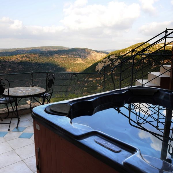 סוויטת אירוח רומנטית צופה לנוף עוצר נשימה מעוצבת בסגנון דרום אמריקאי, מטבח מאובזר, חדר אמבט מרווח, מרפסת רחבת ידיים ועליה ג'קוזי ספא ורהיטי גן.