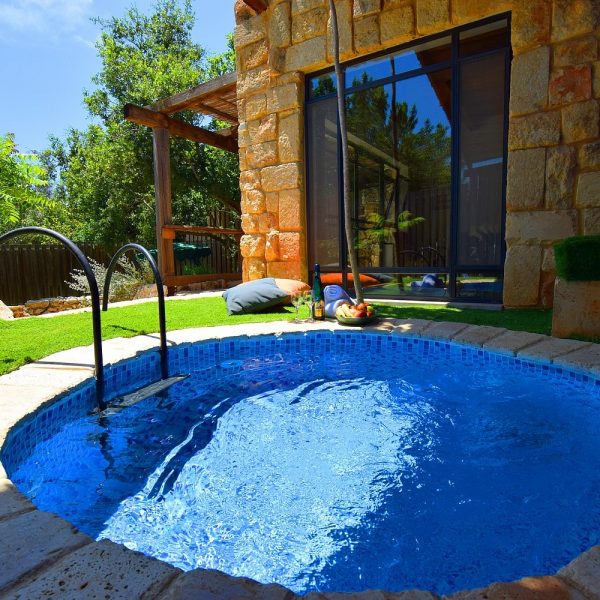 ג'קוזי שקוע ברצפה מול החלון הגדול פונה אל הטבע שבחוץ
