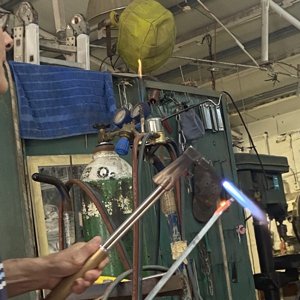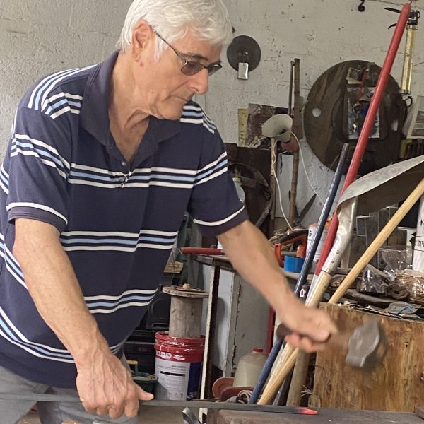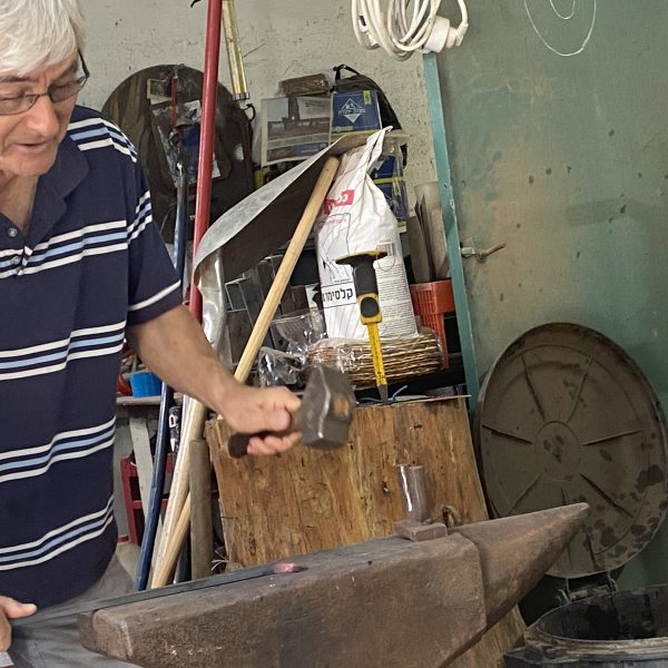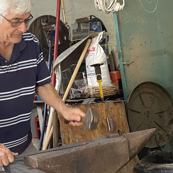 הנפח ישי ארנון, בן הקיבוץ, מדגים בנפחייה שלו ייצור ספירלה ממוט ברזל בעזרת מבער, פטיש וסדן.