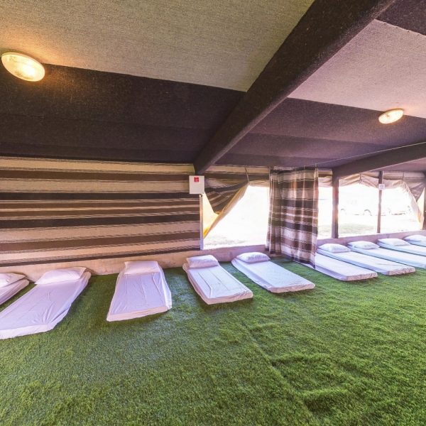 במאהל יש פינות מנגל וכיורים ומטבח חיצוני מצוייד בכיריים מקררים משטחי עבודה ופינות ישיבה.