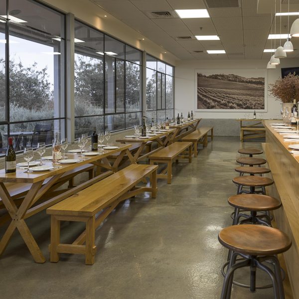 בלב מרכז המבקרים בר יין ארוך ולצידו שולחן אבירים גדול בו יושבים האורחים לטעימת היין .