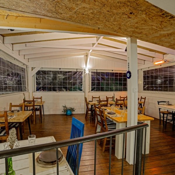 הישיבה היא סביב שולחנות בחצר מוקפת העצים ,שבמרכזה בריכת שכשוך קטנה וכחולה ,העצים הבריכה והנוף מעניקים תחושה של שלוה כפרית .