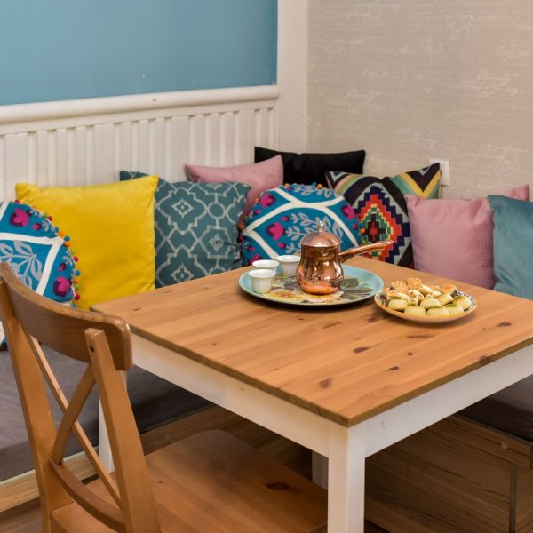 בבית הקפה מרפסת גדולה ומרווחת הצופה אל בתי הכפר, החלק הפנימי מרוהט בטעם רב בגוונים פסטליים ובסגנון עכשווי. בתוך מקרר הזכוכית ובויטרינה מוצגות העוגות של בסמה ששמן יצא למרחוק.