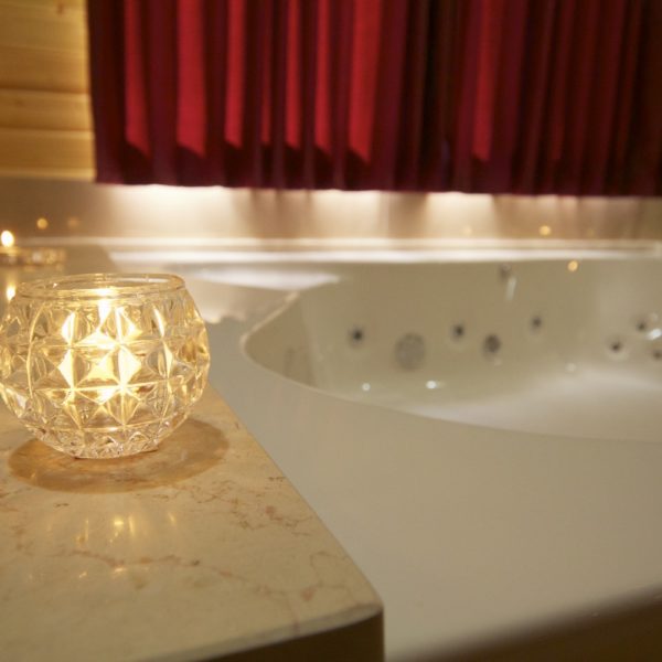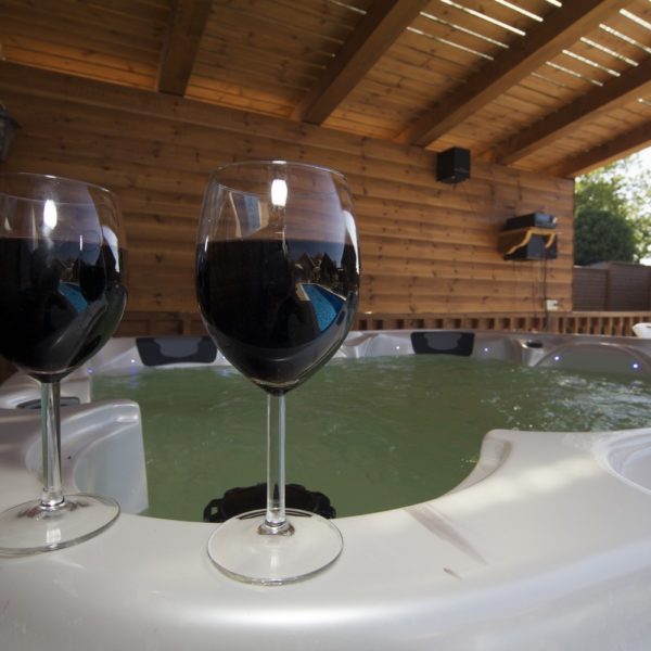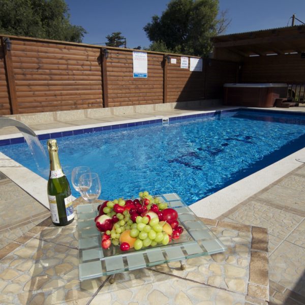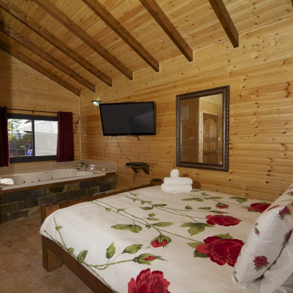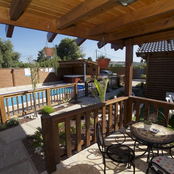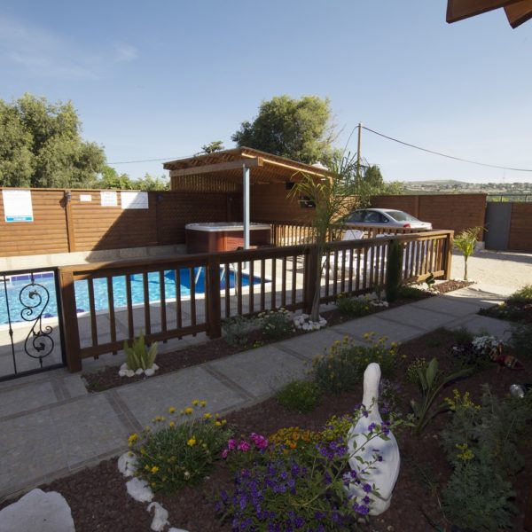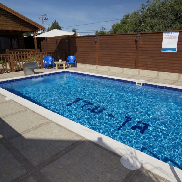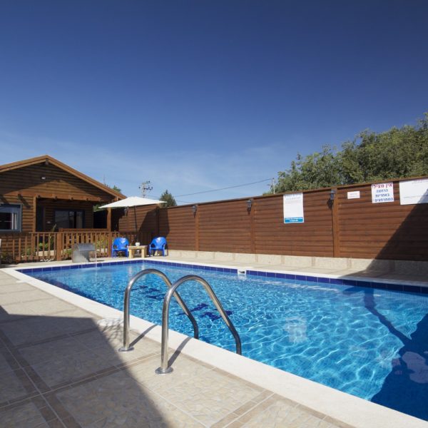 במתחם שלוש בקתות עץ, זהות לחלוטין, הבנויות סביב ברכת שחייה בעלת מפל מים גדול לעיסוי הגב ולידה ג'קוזי חיצוני לשנים עשר איש. הבריכה מקורה ומחוממת בימי החורף. סביב הבריכה כסאות מרגוע ושמשיות ורמקולים המשמיעים מוזיקה לפי טעמם של האורחים. בין הבקתות גינה פורחת, שולחנות וספסלי עץ ופינות מנגל.