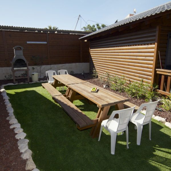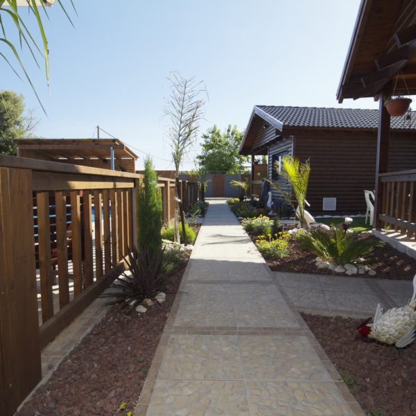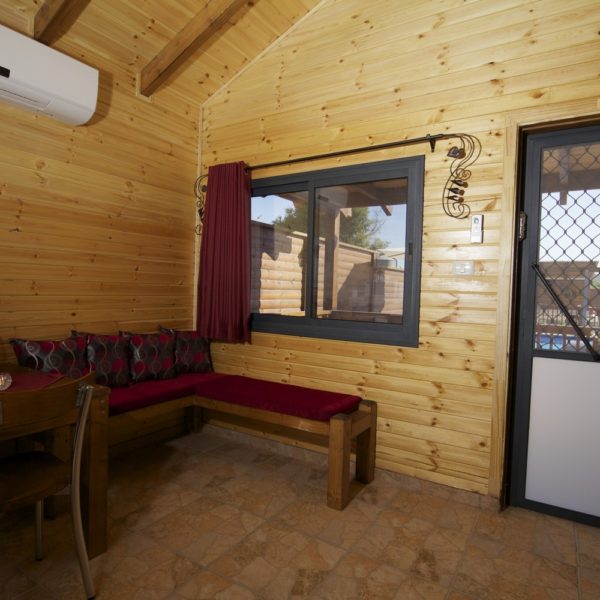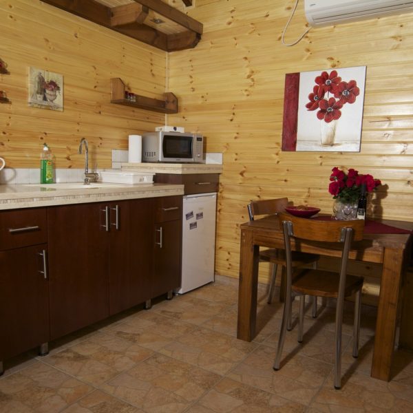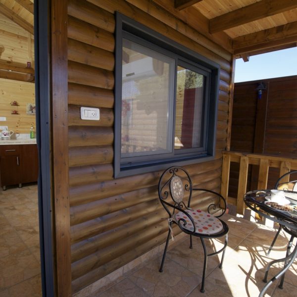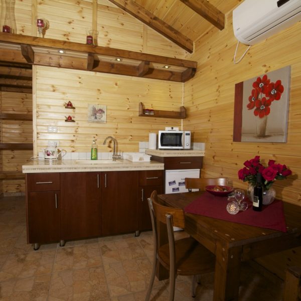 לכל אחת מהבקתות מרפסת עם רהיטי גן המשקיפה על הבריכה. הבקתות גדולות ומרווחות, שטח כל אחת מהן הוא 52 מ"ר, המטבחון מאובזר לחלוטין כולל פלטת בישול וכלי אוכל ולידו שולחן אוכל וכסאות.