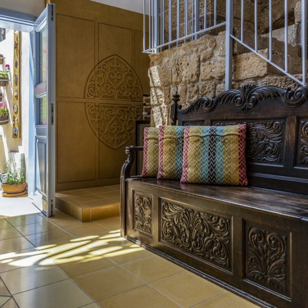 בכל החדרים תקרות גבוהות מקומרות מהן משתלשלות מנורות שנדלייר, מרצפות טרצו אופייניות לעכו ואוסף אקלקטי של רהיטים עתיקים, שחלקם הובאו בשלמותם מאחוזה בטרנסליבניה, כשכלי האוכל והטג'ין ממרוקו.