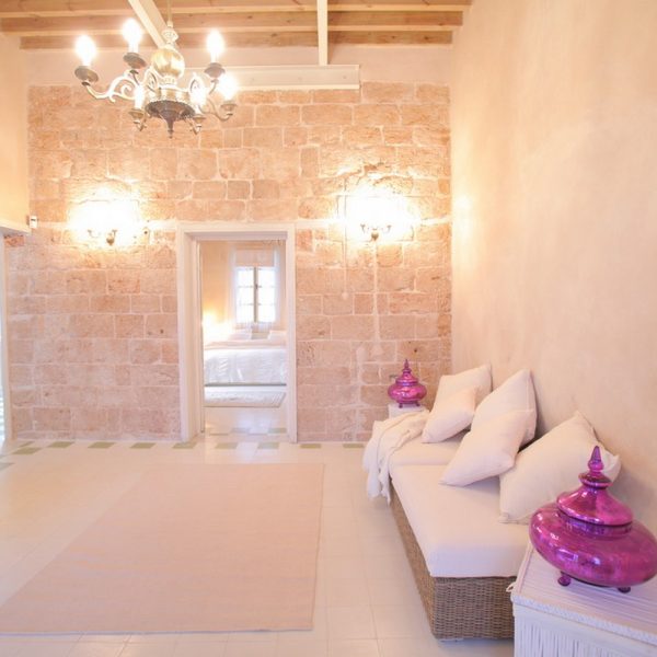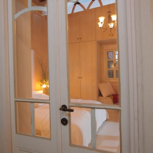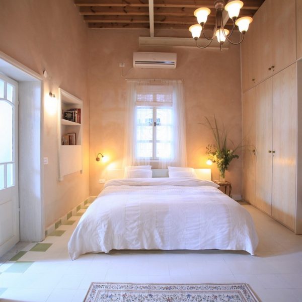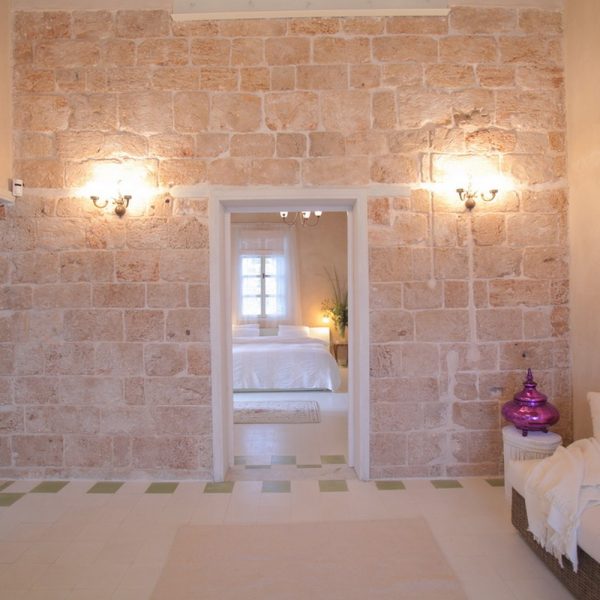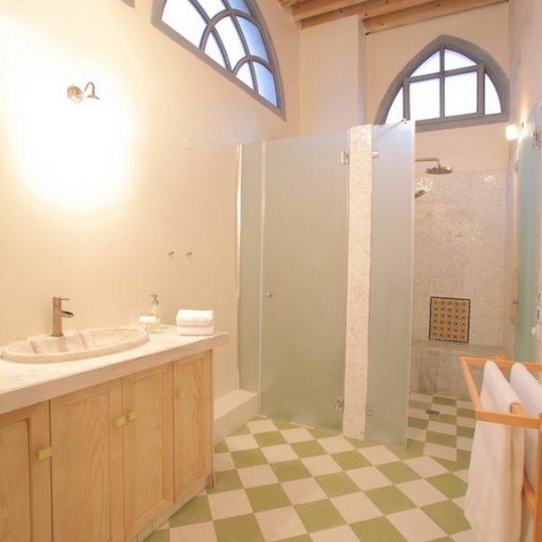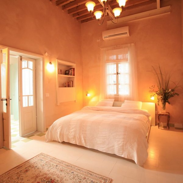 חדר רחצה עם ספסל אבן בסגנון חמאם משיש מקורי מתקופת אל ג'זאר, חדר שינה מרווח במיוחד עם מיטה זוגית גדולה בשטח של 180 ס"מ על 2 מטרים.