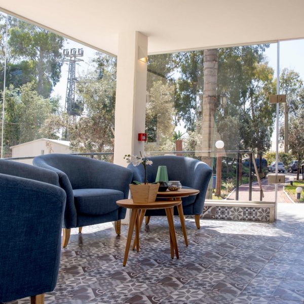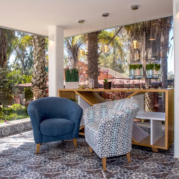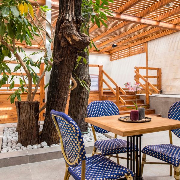 בלב הספא מסביב לעץ נטוע, מתחם מוצל ופתוח ובו שולחנות וכסאות למנוחה ג'קוזי וסאונות .