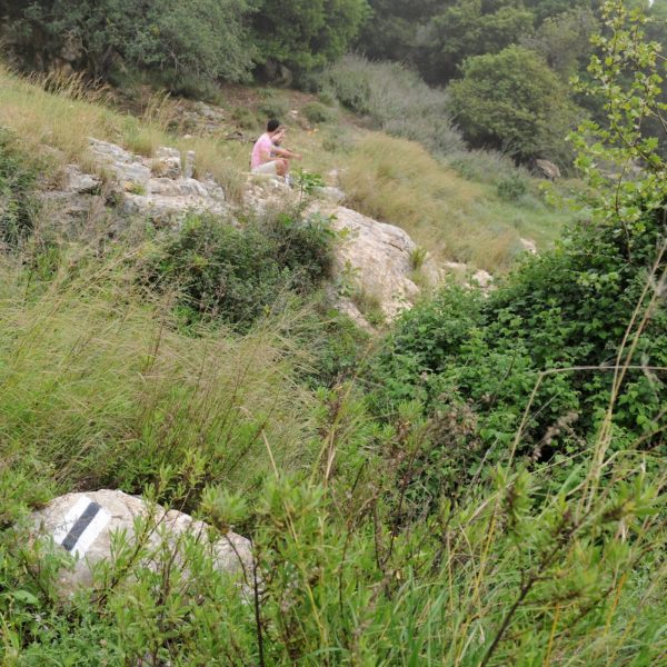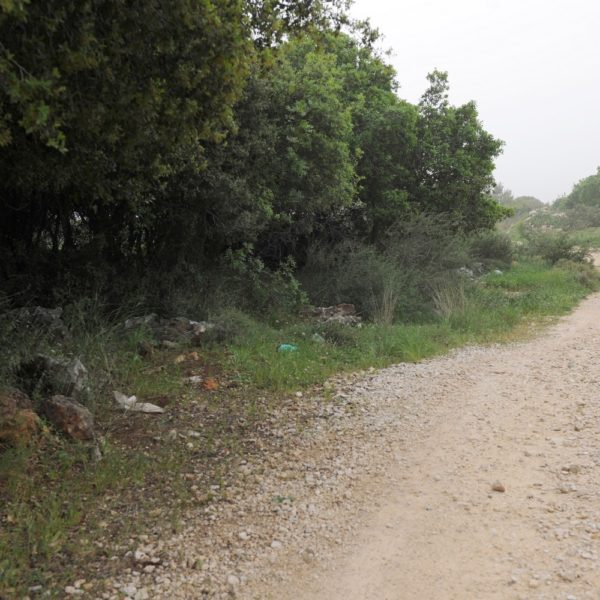 נלך בדרך עפר בין כרמי זיתים צפון מערבה אחרי כ150 מטר נפגוש גדר אבן התוחמת כרם צעיר, נלך לאורכה בשביל המסומן שחור הגולש אל הנחל.