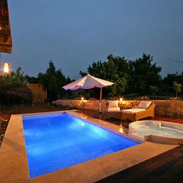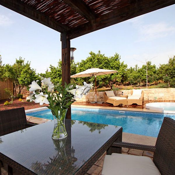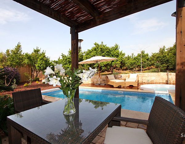 בקתות האבן והבריכה, שבלב הבוסתן, מופרדות זו מזו, מוקפות בעצים המסוככים עליהן מעין רואה ומעניקים לאורחים פרטיות מוחלטת.