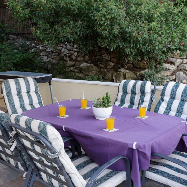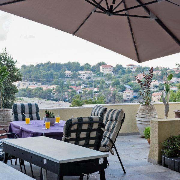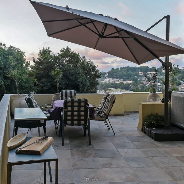מחוץ לסוויטה – מרפסת גדולה מאוד פונה אל הנוף ובה מתקן גריל, שולחן גדול וכיסאות .