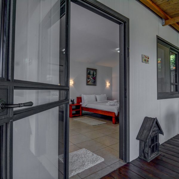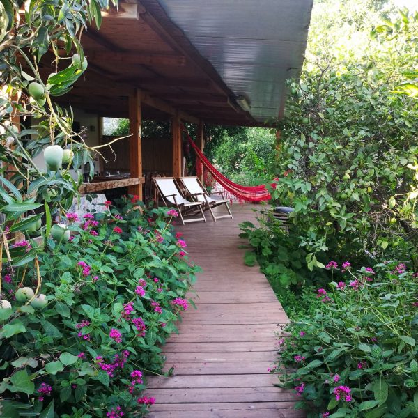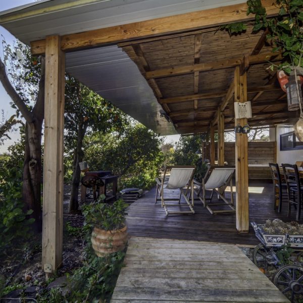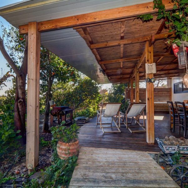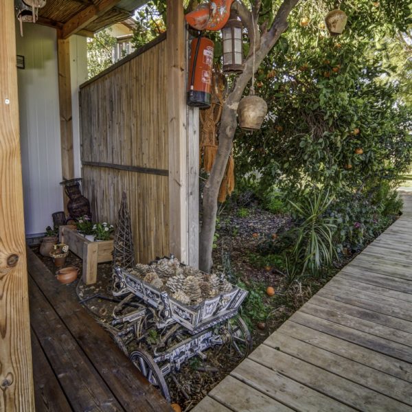 דק עץ מוביל אל הצימר ואל המרפסת המקיפה אותו, השקט במקום מרנין לב והתחושה היא של שלווה כפרית ופסטורלית.