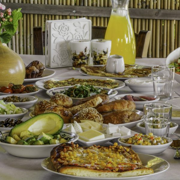 לשולחן מוגשים למעלה מחמישה סוגי סלטים, ריבות , זיתים, טחינה, לאבנה, מוזלי, לחמניות, פיתות, לחמים, פנקייקס, פיצה, ופל בלגי כולם תוצרת בית ונטולי גלוטן.