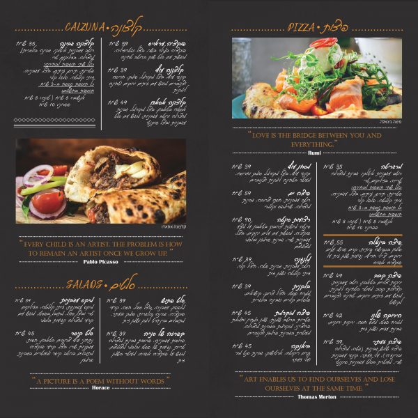 לצד הפיצה מוגש גם קלצונה לסוגיו, סלטים, כריכים,  ארוחות בוקר לסוגיהן  וכמובן שתייה קלה וחמה. מי שאינו אוהב את ריחה של הפיצה המבעבעת בטאבון מוזמן לשבת בגינה הקטנה שבחוץ.